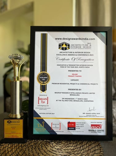"Innovative and Trendsetter interior design firm of the year 2023". North India awards under " Premium residential projects & commercial projects" category for the year 2023