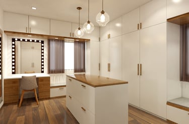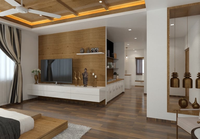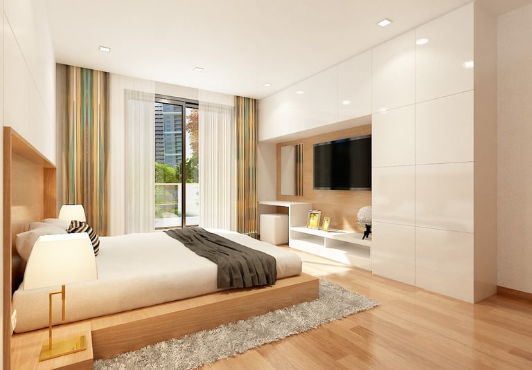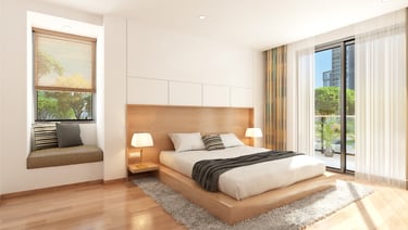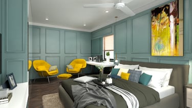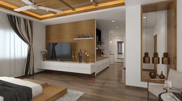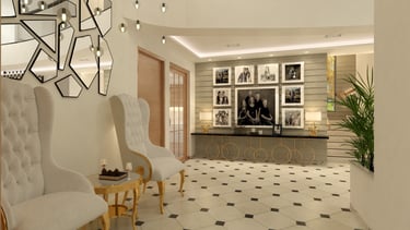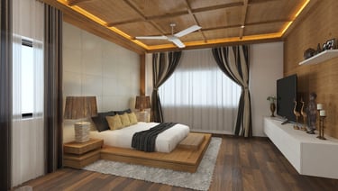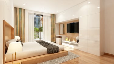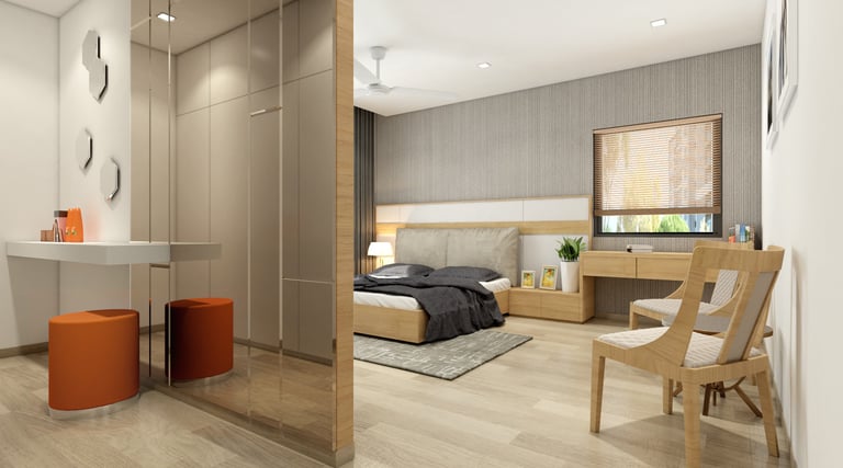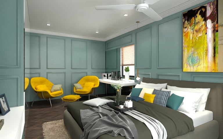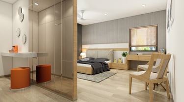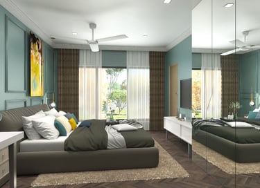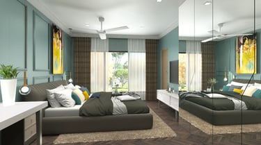 Soft neutral color tones are carefully chosen to complement the villa's classic interior style, adding warmth and sophistication to the living spaces. The furniture, characterized by clean lines and crisp designs, embodies a modern sensibility, offering a sleek and clutter-free ambiance. Furthermore, the combination of soft bedroom lighting, modern artwork, and textured feature walls creates a comfortable and inviting atmosphere, seamlessly blending essential interior design elements to enhance the overall living experience in the villa.
