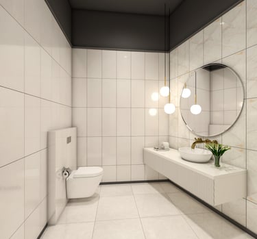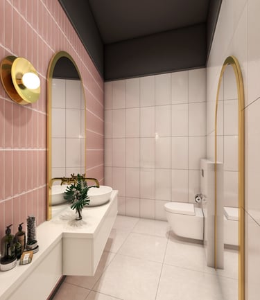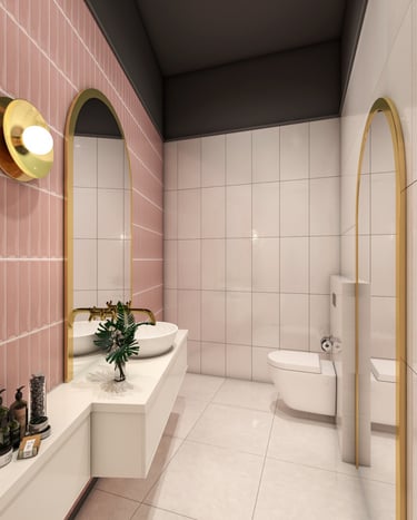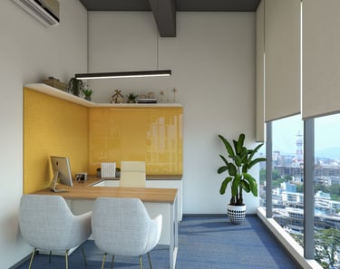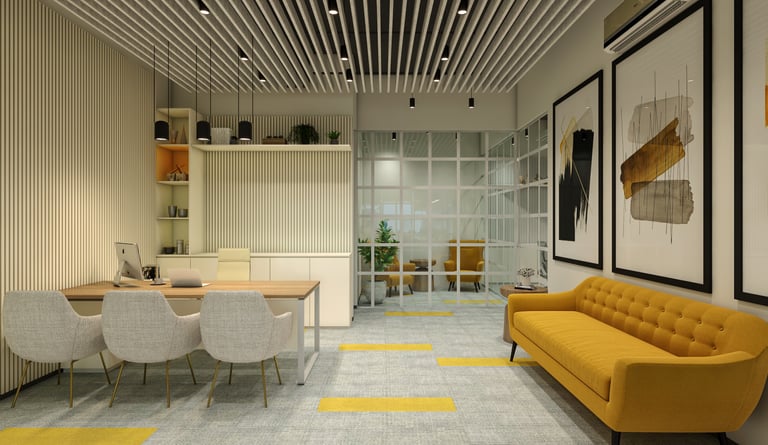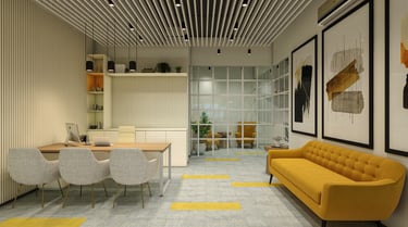 Characterized by clean lines and contemporary furnishings, the ambiance exudes a sense of understated luxury. Amidst a backdrop of muted tones, vibrant splashes of yellow and soft pink playfully interact, infusing the space with a warm and inviting aura.